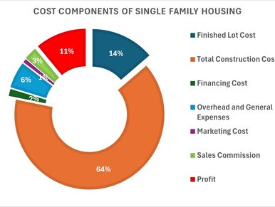 A 2025 study by the National Home Builders Association found that construction accounted for 64% of the cost of housing. Over a third of the costs are associated with site, general expenses, and profits.